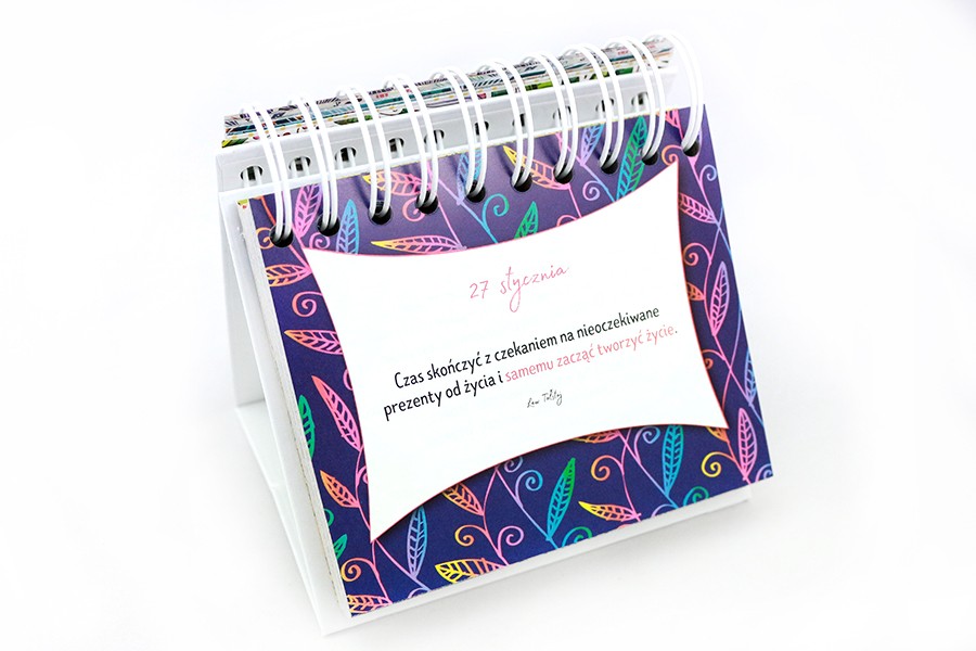 Jak dobrze zacząć dzień? Wstać prawą nogą, bez pośpiechu wypić poranną kawę? Można i tak. Ale mamy ciekawszą propozycję. Bardziej oryginalną. Co byście powiedzieli, by każdego ranka zrobić sobie nowy prezent? I tak przez 365 dni w roku. Codziennik opatrzony piękną, bajkowo kolorową grafiką, na każdy dzień z inną inspirującą myślą, który możecie podarować sobie samym i osobom bliskim, poprawi nastrój, skłoni do uśmiechu, zmotywuje do działania i zmagań z życiem. Co ważne, można się nim cieszyć przez wiele lat.