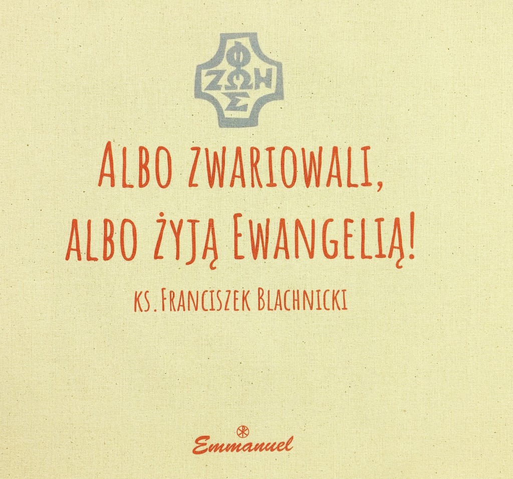 Bawełniana jasna torba z długami uchami. Na torbie znajduje się kolorowy nadruk: Albo zwariowali, albo żyją Ewangelią! ks. Franciszek Blachnicki