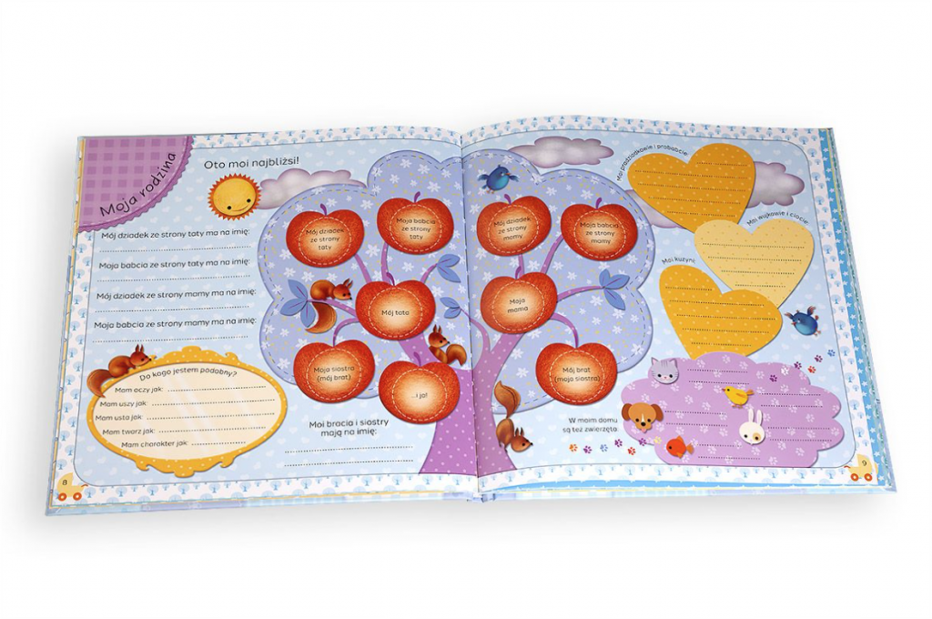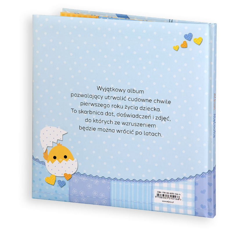 W albumie znajdziesz miejsce na zapisanie ważnych dat, doświadczeń i wydarzeń oraz kolorowe ramki na zdjęcia dokumentujące pierwszy rok życia, do których ze wzruszeniem będzie można wrócić po latach.