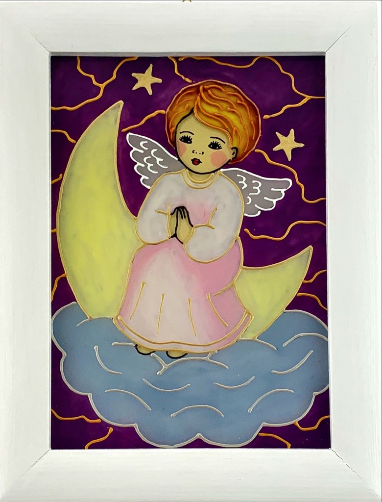 Obraz w białej drewnianej ramie z wizerunkiem aniołka siedzącego na chmurce. Do zawieszenia na ścianie.