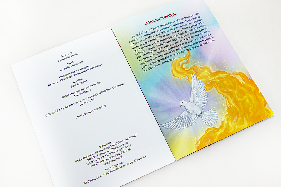 Siedem historii, które pokazują, jakie dary otrzymujemy od Ducha Świętego na chrzcie świętym i czym one są. Dzięki zadaniom umieszczonym w książce dzieci będą mogły łatwiej przyswoić treści zawarte w opowiadaniach i zapamiętać informacje dotyczące Ducha Świętego i Jego darów. Publikacja zawiera krótkie wyjaśnienie, kim jest Duch Święty i modlitwę, którą dzieci wraz z rodzicami będą mogli odmawiać każdego dnia. Na jednej ze stron znajduje się postać Aniołka Michałka, którą można zawiesić nad łóżkiem dziecka lub postawić na jego biurku.