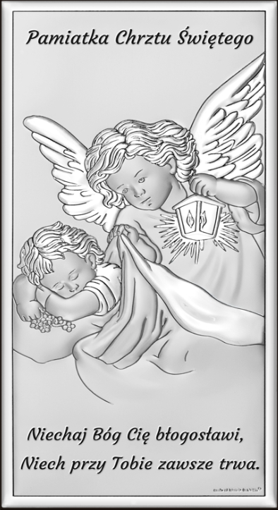 Obrazek srebrny przedstawiający aniołka z latarenką nad dzieckiem z napisem: Pamiątka Chrztu Świętego