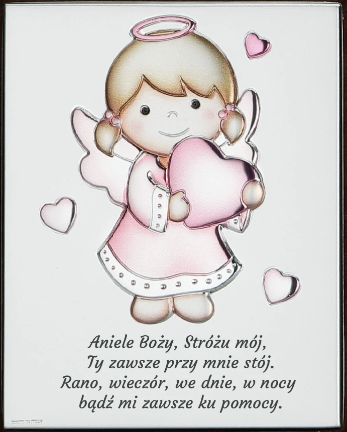 Kolorowy obrazek posrebrzany przy użyciu technologii PVD z napisem z przodu.