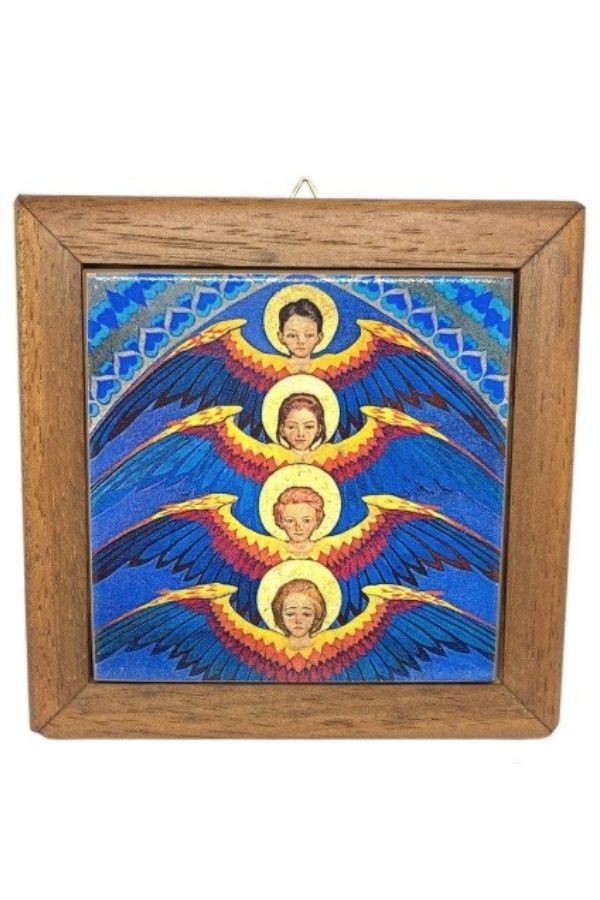 Płytka ceramiczna w drewnianej ramce o wymiarach 13 x 13 cm, w pudełku kartonowym z okienkiem.