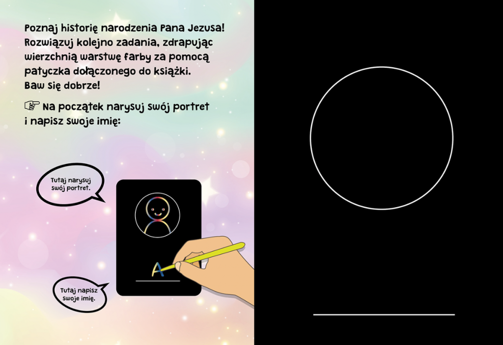 Poznaj historię narodzenia Jezusa! Rozwiązuj kolejno zadania, zdrapując wierzchnią warstwę farby za pomocą patyczka dołączonego do książki. Baw się dobrze!