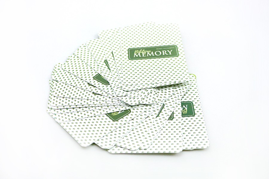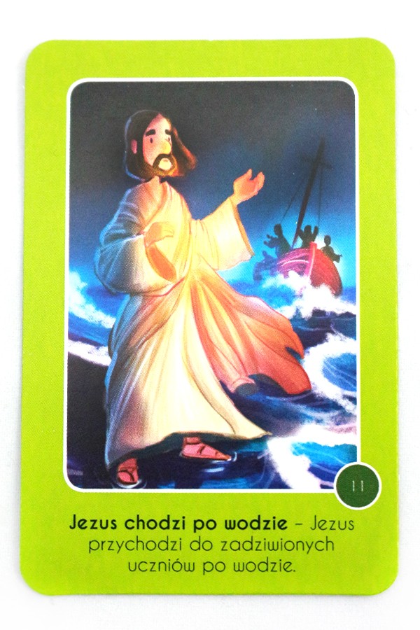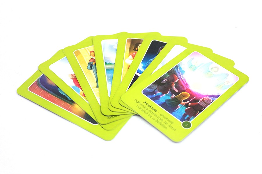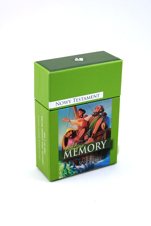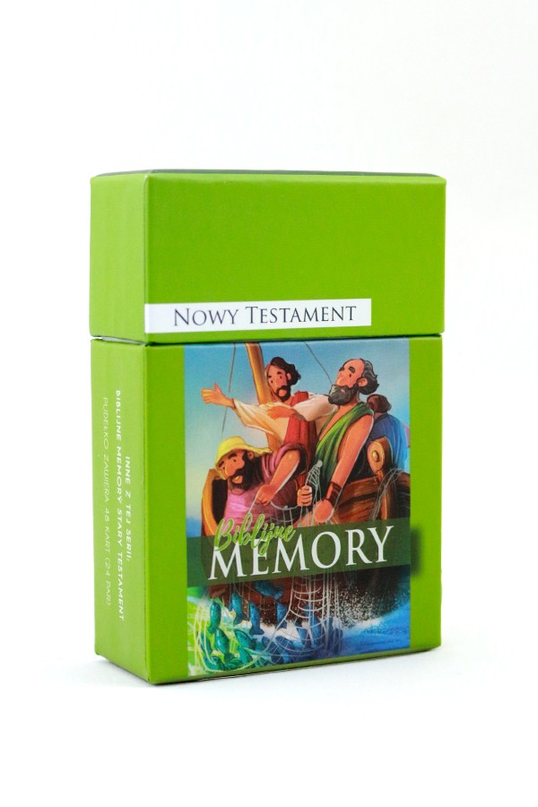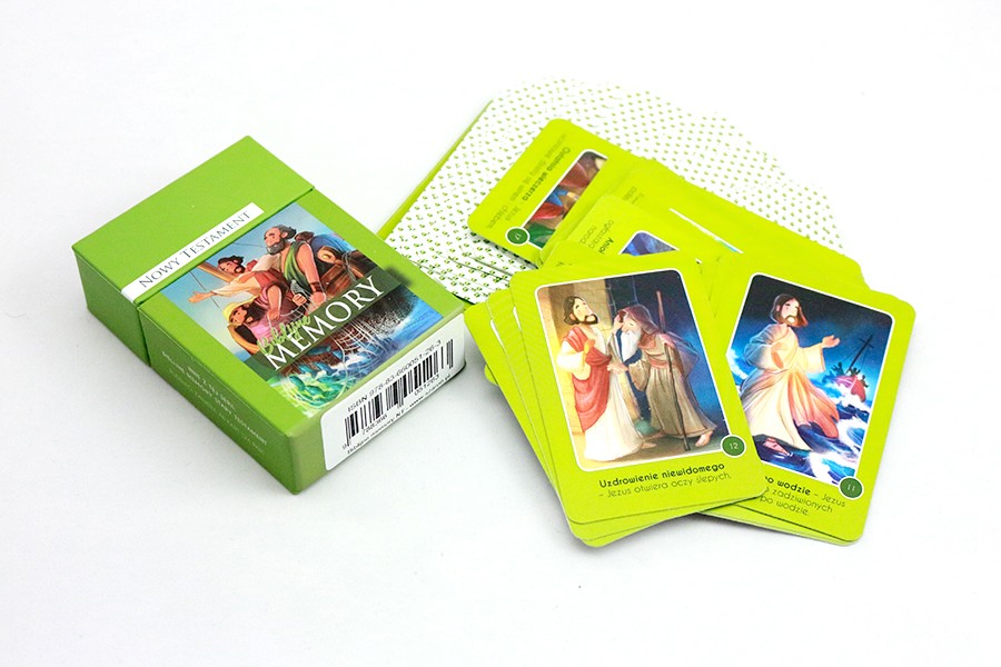 Pudełko zawiera zestaw kart memory z pięknymi ilustracjami i krótkimi opisami historii biblijnych.