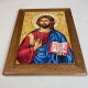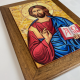Ozdobna kolorowa płytka ceramiczna z obrazem Chrystusa Pantokratora, w drewnianej ramie. Wyprodukowana w Asyżu we Włoszech.