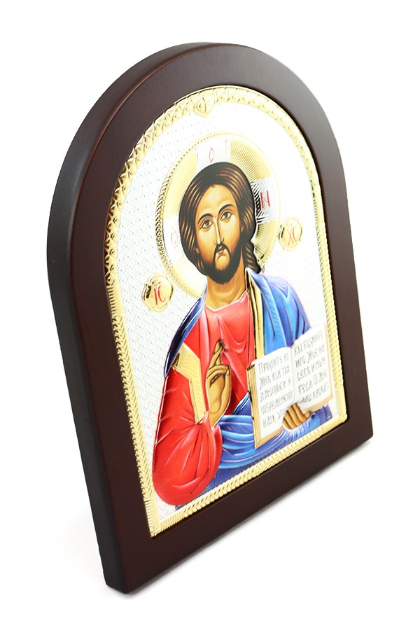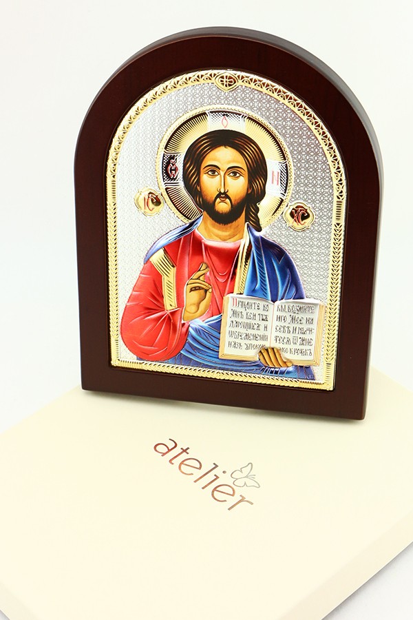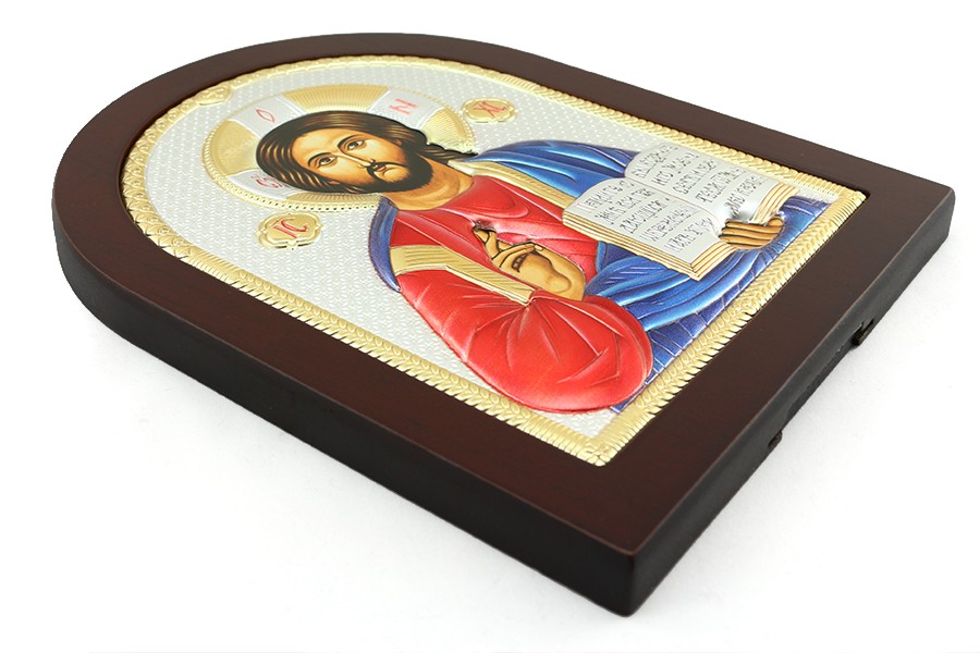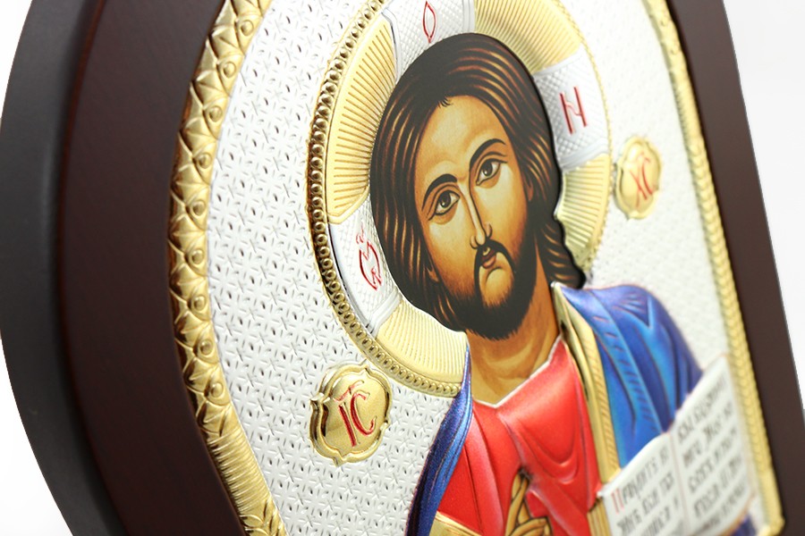 Obrazek srebrny przedstawiający wizerunek Chrystusa Pantokratora.