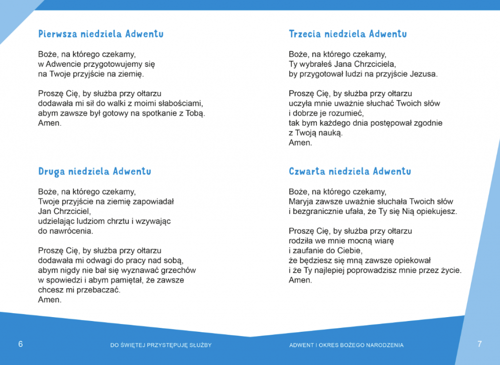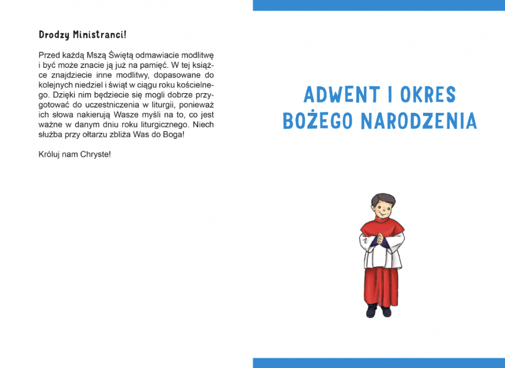 Do każdej Mszy Świętej ministranci przygotowują się, odmawiając modlitwę. Oprócz zwyczajowych formuł, które prawdopodobnie znają na pamięć, mogą również wykorzystać teksty zaproponowane w tym modlitewniku, dopasowane do wszystkich niedziel i najważniejszych świąt w ciągu roku liturgicznego. Są wśród nich również modlitwy przygotowane na msze okolicznościowe, odprawiane w czasie takich wydarzeń jak Pierwsza Komunia Święta, ślub czy początek roku szkolnego. Przez nakierowanie myśli na to, co jest istotne w danym dniu, modlitwy te pozwolą wszystkim służącym przy ołtarzu lepiej przeżyć każdą Eucharystię.