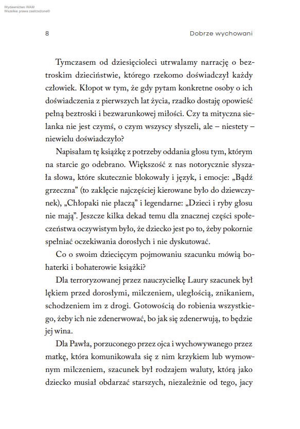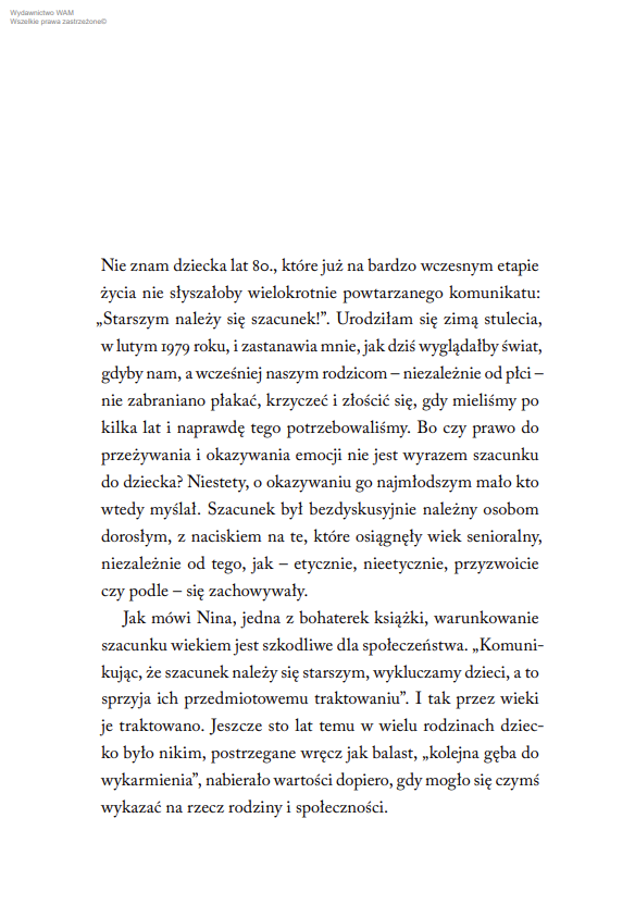 W swojej poruszającej książce Ewa Koza oddaje głos tym, którym odebrano go najwcześniej. Jej rozmówcy odsłaniają to, co przez lata skrywała fasada beztroskiego dzieciństwa i mitycznej rodzinnej sielanki. Za nią kryją się: strach, samotność, emocjonalne zaniedbanie i przemoc – często ubrana w słowo „szacunek”.