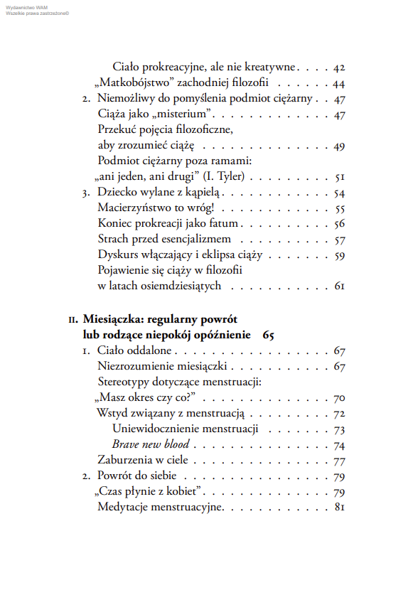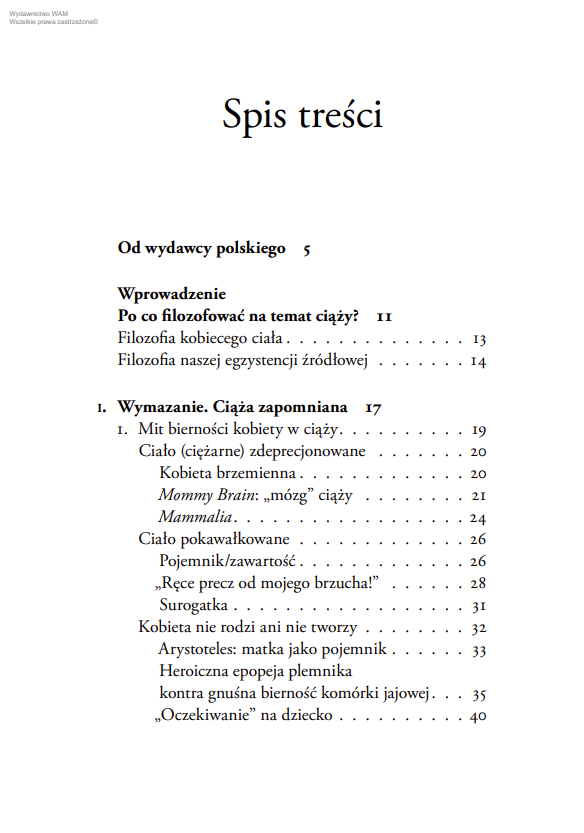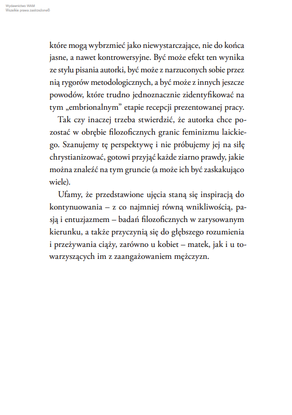 Autorka porusza ważne pytania o kobiecą tożsamość i granice własnego „ja”, które zmieniają się w ciągu tych dziewięciu wyjątkowych miesięcy. Nie unika też trudnych tematów, takich jak poronienia czy niepłodność. Łączy osobiste doświadczenia z myślą filozoficzną, zapraszając czytelnika do uważnego spojrzenia na jedno z najważniejszych doświadczeń ludzkiego życia.