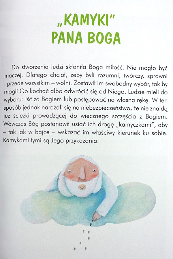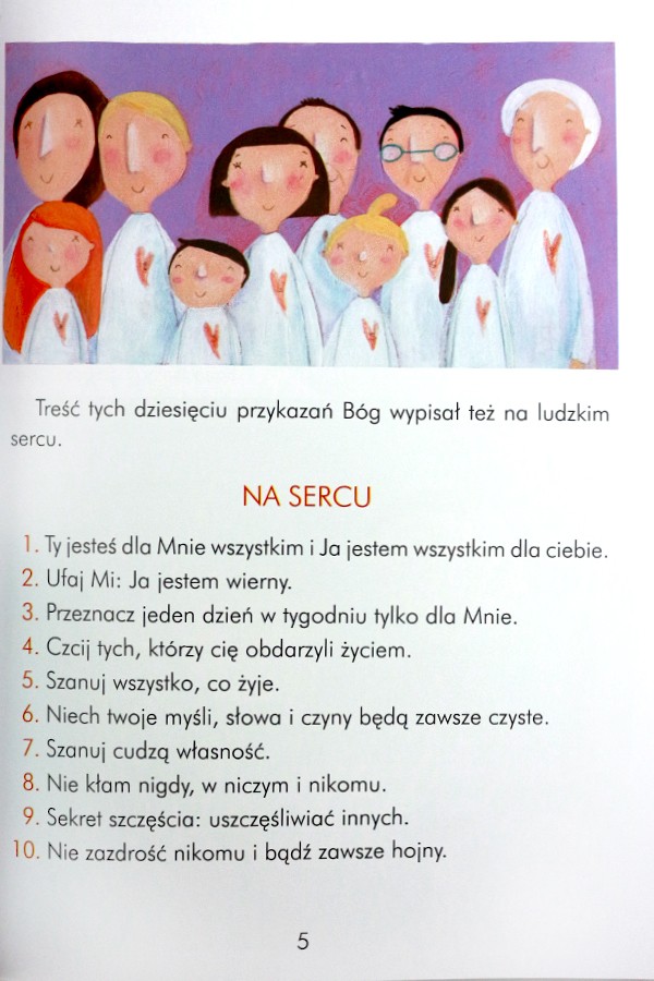 Książeczka kierowana jest do dzieci, ale z pewnością skorzystają z niej także rodzice. Wspólna lektura z dzieckiem jest dialogiem, zwłaszcza jeśli do tej rozmowy jest zaproszony także Pan Bóg. W tej publikacji znaczenie każdego z przykazań zostało zestawione z krótkim ilustrującym go opowiadaniem lub inną historią z Biblii. Na początku mowa jest o tym, że przykazania Boże zostały wyryte na kamiennych tablicach, ale także w sercu każdego człowieka.
