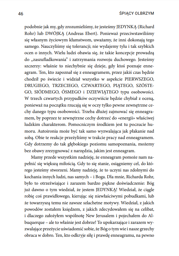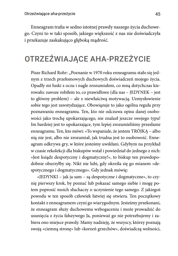 Enneagram to prastara koncepcja będąca drogą do wewnętrznego uleczenia i duchowego wzrostu. Zyskała popularność za sprawą bestsellerowej publikacji Richarda Rohra oraz Andreasa Eberta. Łącząc podejście psychologiczne, duchowe i filozoficzne, stanowi ona uniwersalny opis żywego procesu, jakim jest poznanie samego siebie, do którego dążą ludzie pod każdą szerokością geograficzną.