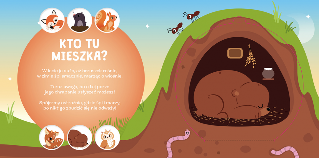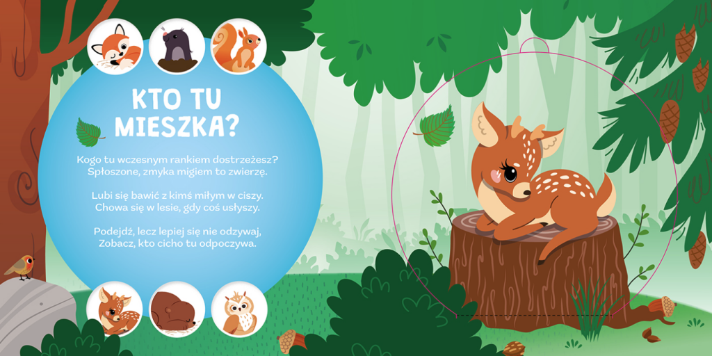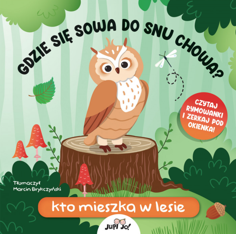 Czy jesteście ciekawi, kto mieszka w lesie? Przekonajcie się, jakie zwierzęta mają swoje domy w dziupli drzewa, w podziemnej jamie albo pośród zielonych gałęzi. Sami będziecie odkrywać wszystkie te miejsca, podnosząc okienka i zaglądając do kryjówki sowy, niedźwiedzia, lisa i innych zwierząt. W odkrywaniu siedzib mieszkańców lasu pomogą wam zabawne rymowanki i piękne ilustracje.