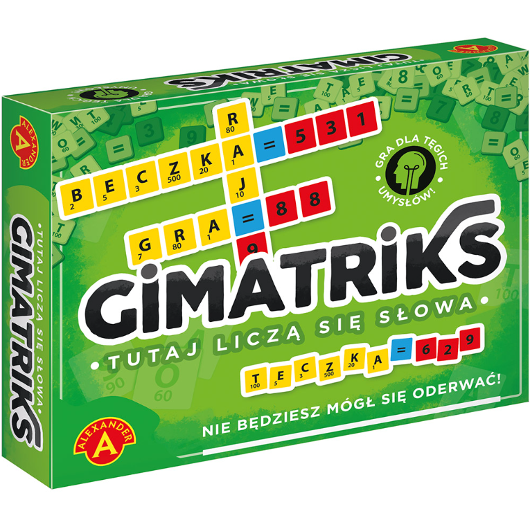 Tutaj liczą się słowa! Nie będziesz mógł się oderwać! Gimatriks to wyjątkowa gra słowna, w której wygrywa ten, kto… najlepiej liczy! Literom nadano wartości liczbowe, zatem układaj słowa tak, aby ich wartość odpowiadała wylosowanym liczbom. Bądź kreatywny i szukaj takich słów, za które zgarniesz jak najwięcej punktów. Oto prawdziwa gimnastyka dla mózgu zmuszająca do aktywności obie jego półkule! Jesteś gotowy podjąć to wyzwanie?