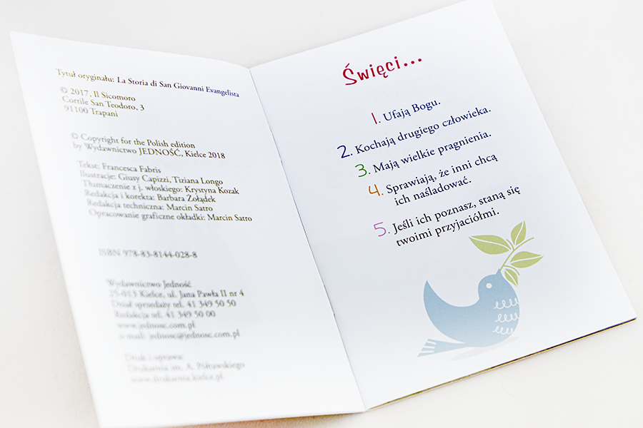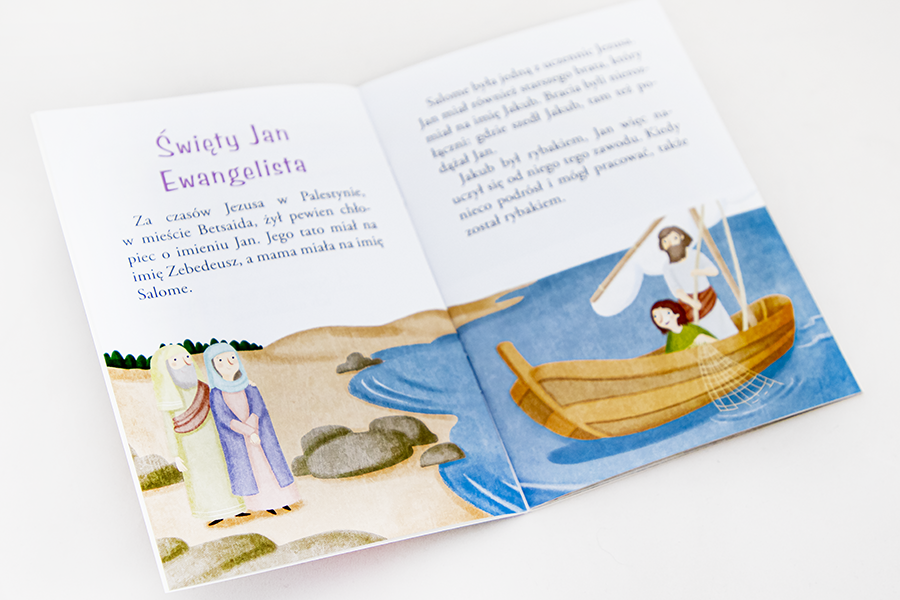 Historia św. Jana Ewangelisty opowiada losy jednego z najpopularniejszych świętych. Dzięki kolorowym stronom tej książeczki dzieci poznają nie tylko najważniejsze informacje biograficzne dotyczące jej osoby, lecz także będą mogły zrozumieć jej duchowość i charyzmat.