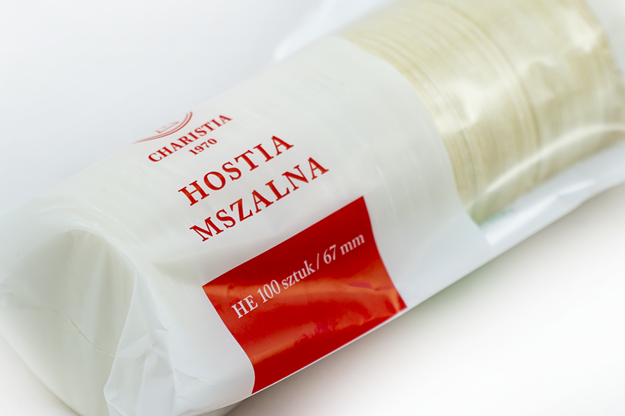 Hostia mszalna o średnicy 67 mm, z obustronnym znakiem krzyża, z zamkniętymi krawędziami zewnętrznymi.