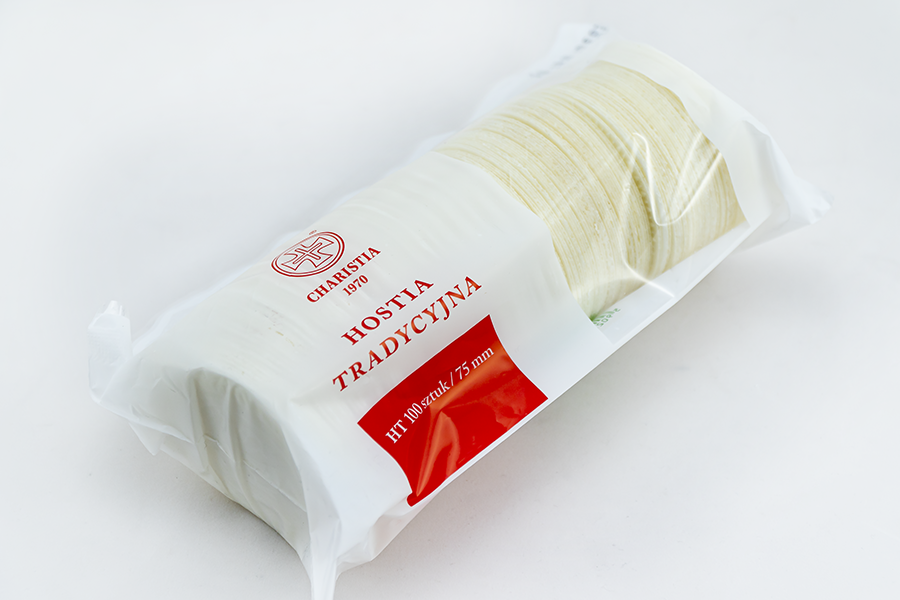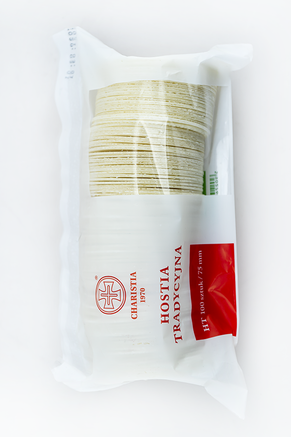 Hostia mszalna tradycyjna o średnicy 75 mm, z zamkniętymi krawędziami zewnętrznymi.