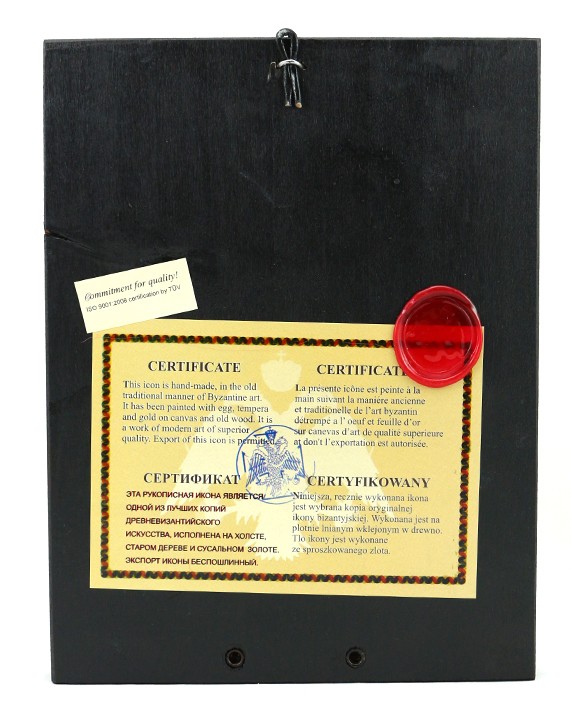 Ta ręcznie wykonana ikona jest wybraną kopią oryginalnej ikony bizantyjskiej. Wykonana została na płótnie lnianym wklejonym w drewno. Tło ikony stanowi sproszkowane złoto.