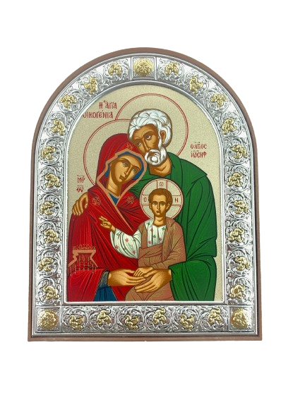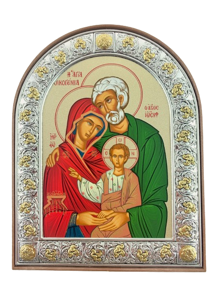 Replika ikony Świętej Rodziny. Metalowa ramka została posrebrzona srebrem próby 925.