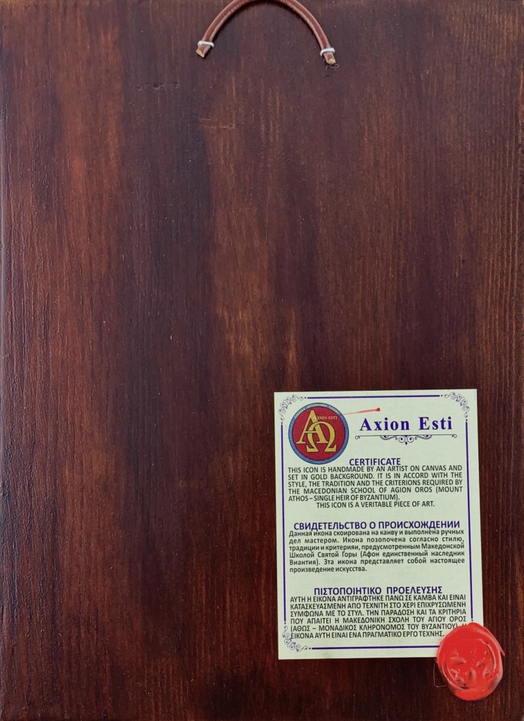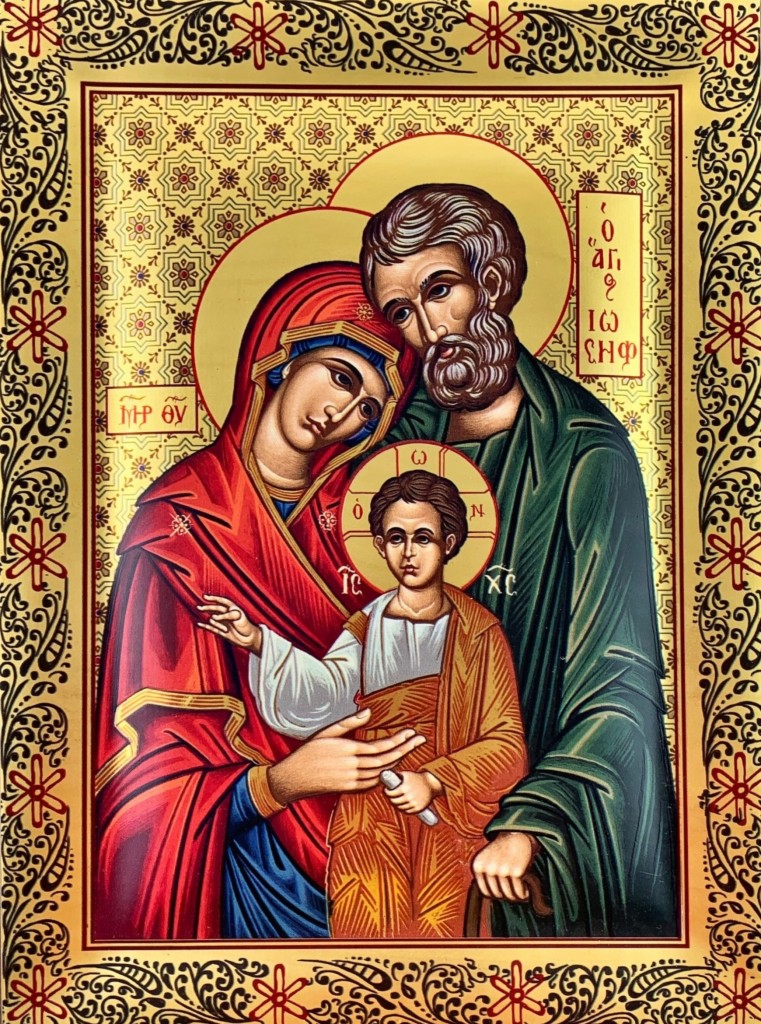 Ikona z wizerunkiem Świętej Rodziny, wykonana na desce, wypukła. Do zawieszenia na ścianie.