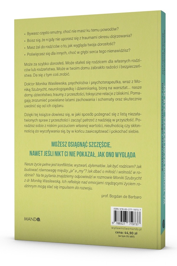 Doktor Monika Wasilewska, psycholożka i psychoterapeutka, wraz z Moniką Szubrycht, neurologopedką i dziennikarką, biorą na warsztat… nasze domy, dzieciństwo, traumy z przeszłości, toksyczne relacje z bliskimi. Pomagają zrozumieć powielane latami zachowania i schematy oraz skutecznie uwolnić się od ich ciężaru. Dzięki tej książce dowiesz się, w jaki sposób pożegnać się z listą niezałatwionych spraw z przeszłości i zacząć patrzeć z nadzieją w przyszłość. Poradzisz sobie z niskim poczuciem własnej wartości, nieufnością czy skłonnością do wycofywania się, by w końcu zaakceptować i pokochać siebie.