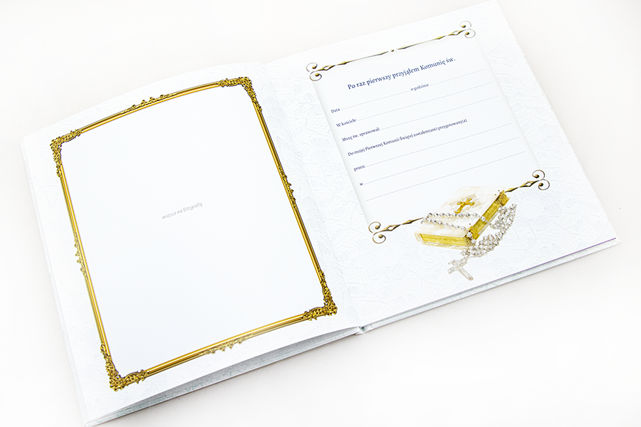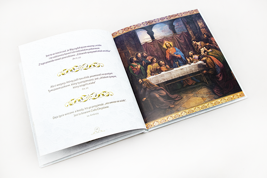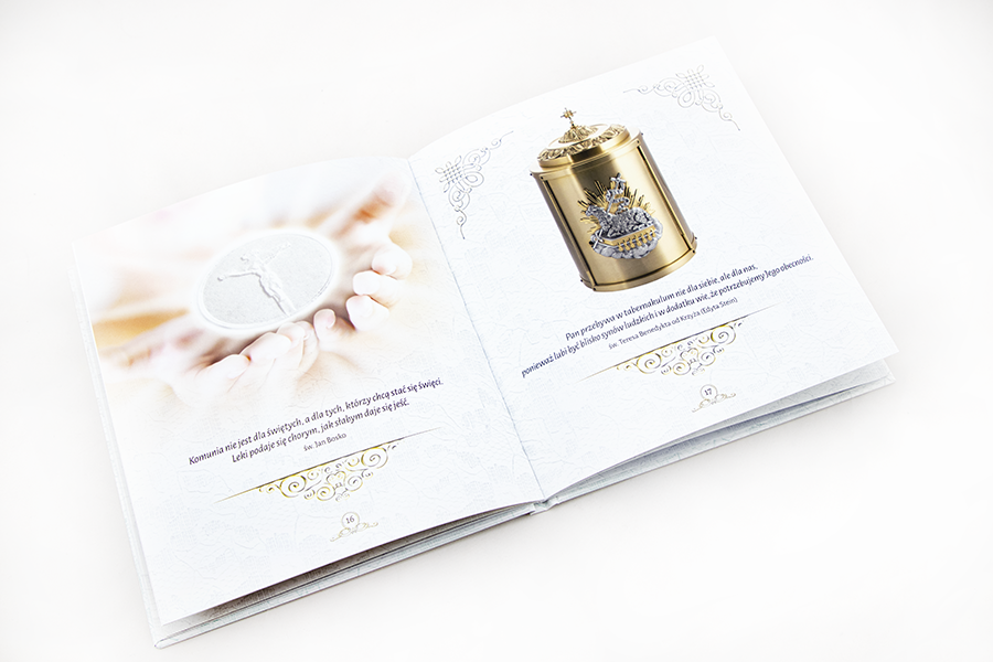 Doskonały upominek z okazji przyjęcia Pierwszej Komunii Świętej. Można tu wpisać ważne daty, refleksje i życzenia. Nie brakuje też stron przeznaczonych na wklejenie fotografii. Książka może być miłym dodatkiem do życzeń. Album zawiera cytaty o Eucharystii pochodzące z nauczania ostatnich papieży, Katechizmu Kościoła katolickiego, wypowiedzi świętych z różnych epok i ojców Kościoła.