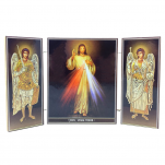 Drewniany tryptyk w aksamitnej bordowej oprawie, z wizerunkiem Jezusa Miłosiernego.