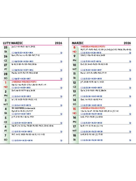 Dodatkowy atut kalendarza to jego niewielkie wymiary 7,50 x 11,50 cm, dzięki którym można włożyć go do Pisma Świętego, aby rozważać Słowo Boże wraz z całym Kościołem.