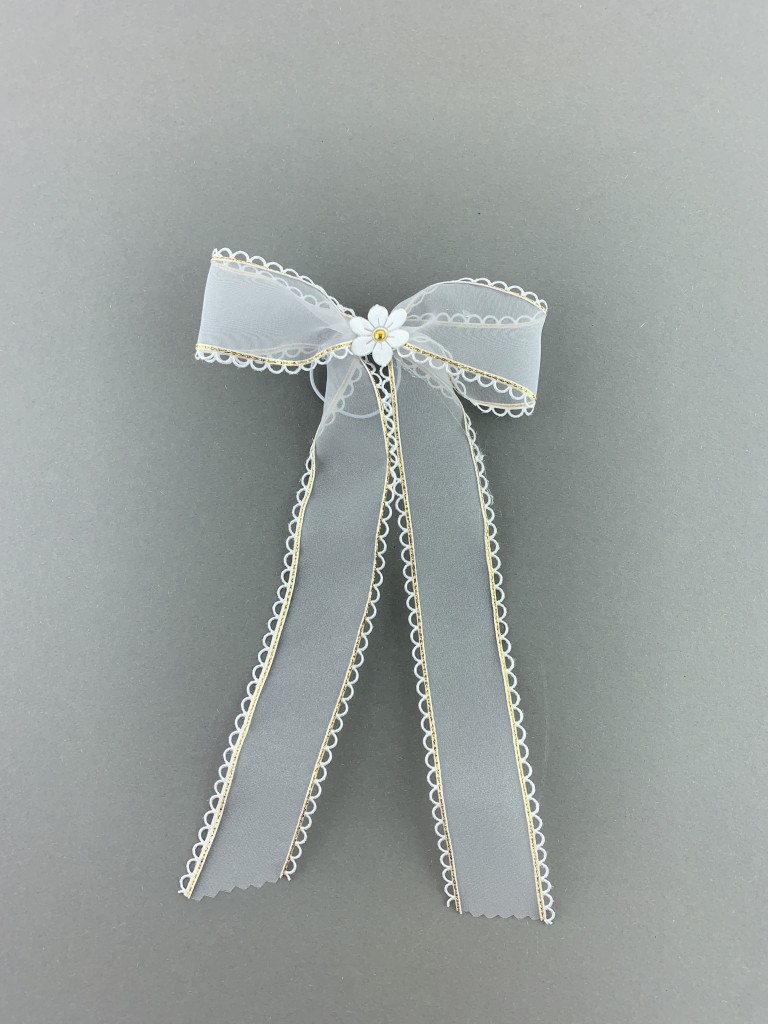 Biała szyfonowa kokarda do świecy kościelnej. Brzegi kokardy wykończone delikatnym wzorem oraz złota nitką, na środku biały kwiatuszek. Kokarda na gumce.