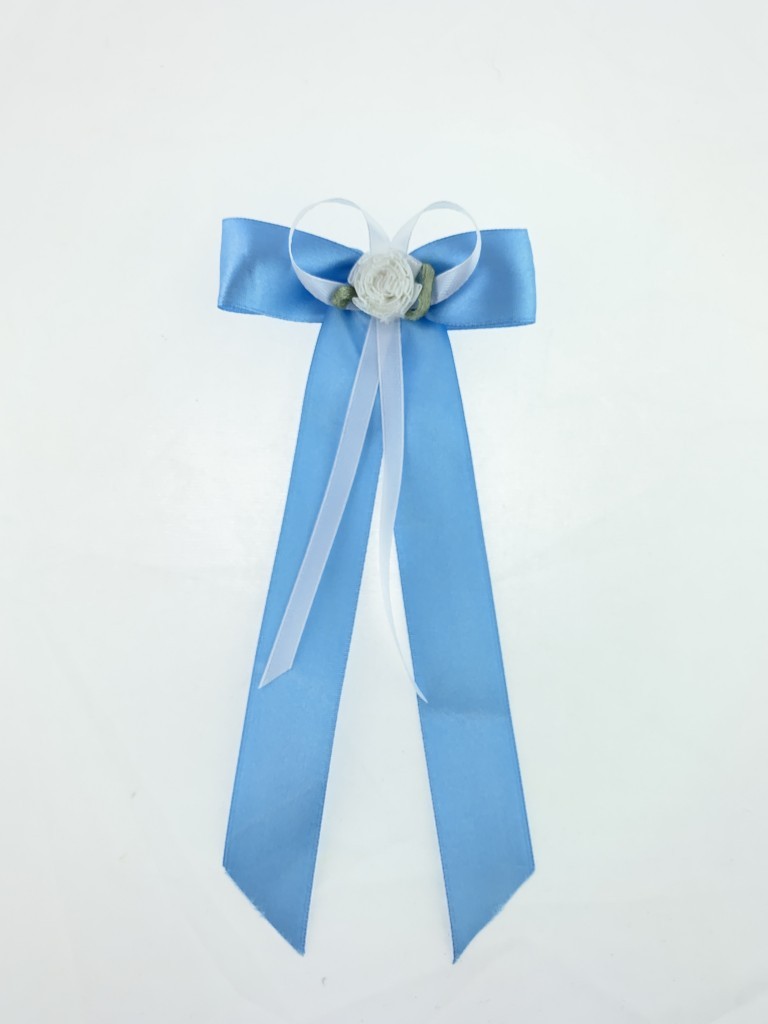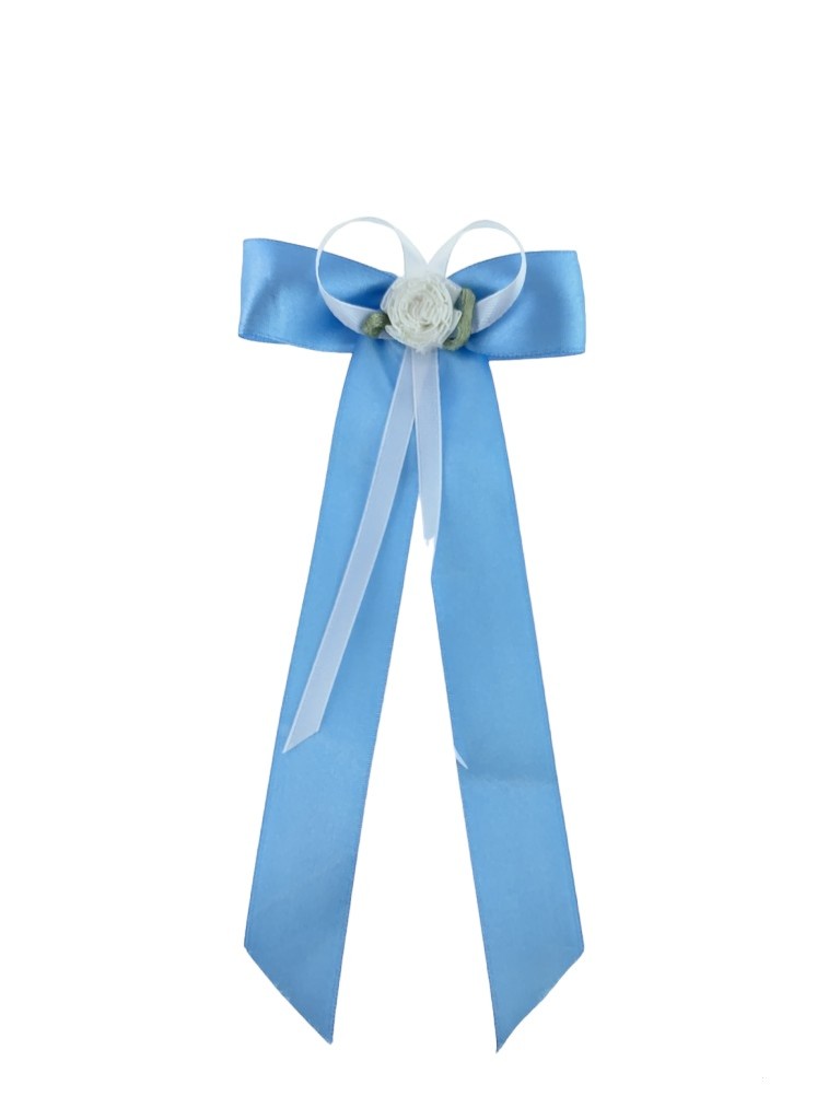 Atłasowa kokardka w kolorze niebieskim na świecę, zdobiona kwiatuszkiem.