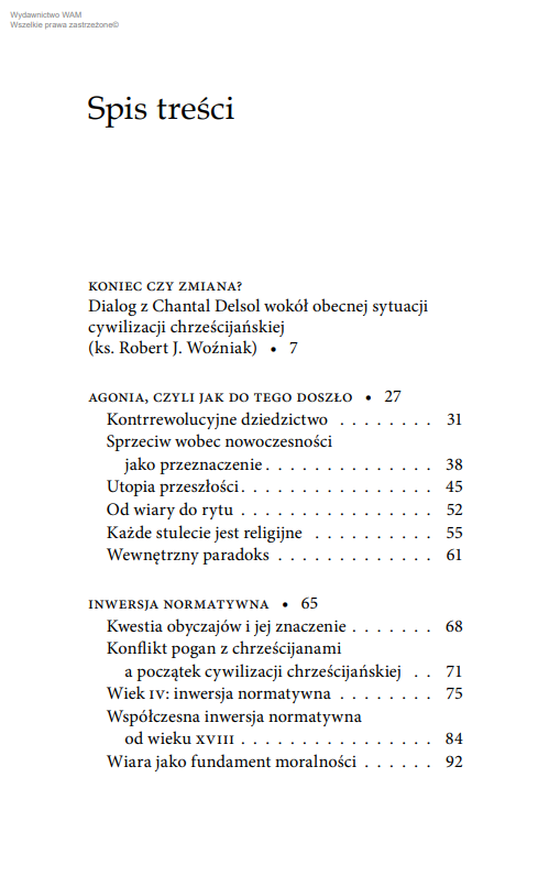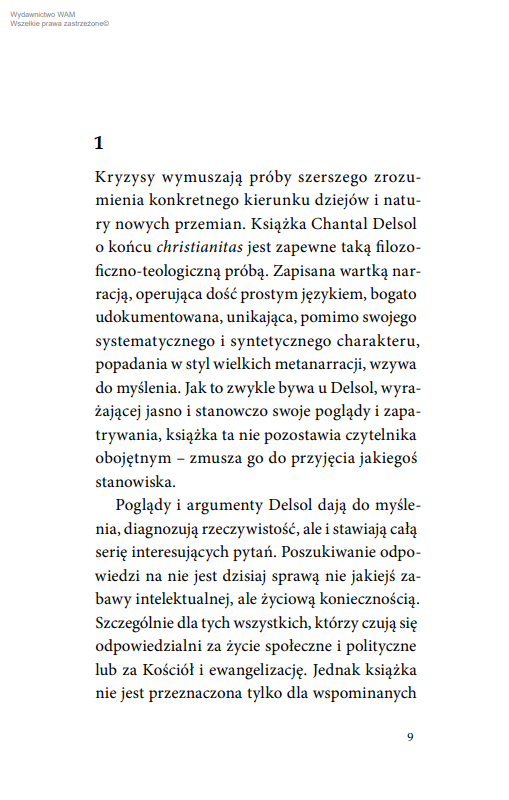 Książka dotknie każdego zainteresowanego tym, co dzieje się dzisiaj z naszą szeroko rozumianą rzeczywistością społeczną. Tak wierzących, jak niewierzących. Wszyscy musimy – a zmusza nas do tego świat – postawić sobie zasadnicze pytanie o miejsce i rolę kultury chrześcijańskiej w naszym życiu… Nie mam wątpliwości, iż dzieło Delsol to must read dla wszystkich zainteresowanych szeroko rozumianym życiem społecznym i jego współczesnymi problemami.