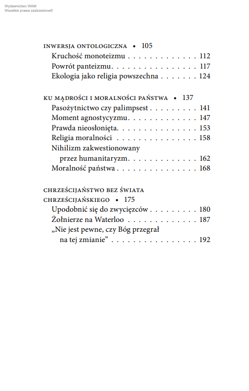 To książka ważna i prowokująca spory. „Agonia cywilizacji chrześcijańskiej” – cóż znaczy ta formuła w dziele katolickiej filozofki? Przecież nie oznacza końca religii, bowiem – zapewnia autorka – społeczeństwo w pełni ateistyczne nie może istnieć. Proponuje ona zachować czujną uwagę wobec ideologizacji przekonań. Przeciwstawia chrześcijanom używającym siły – chrześcijan uważności i cierpliwości, bohaterów pokornej miłości. Ta erudycyjna, błyskotliwa, fascynująca lektura opowiada o dziejach katolicyzmu zmagającego się z nowoczesnością.
