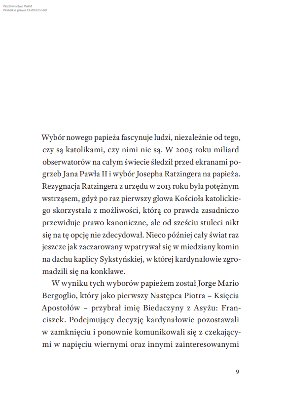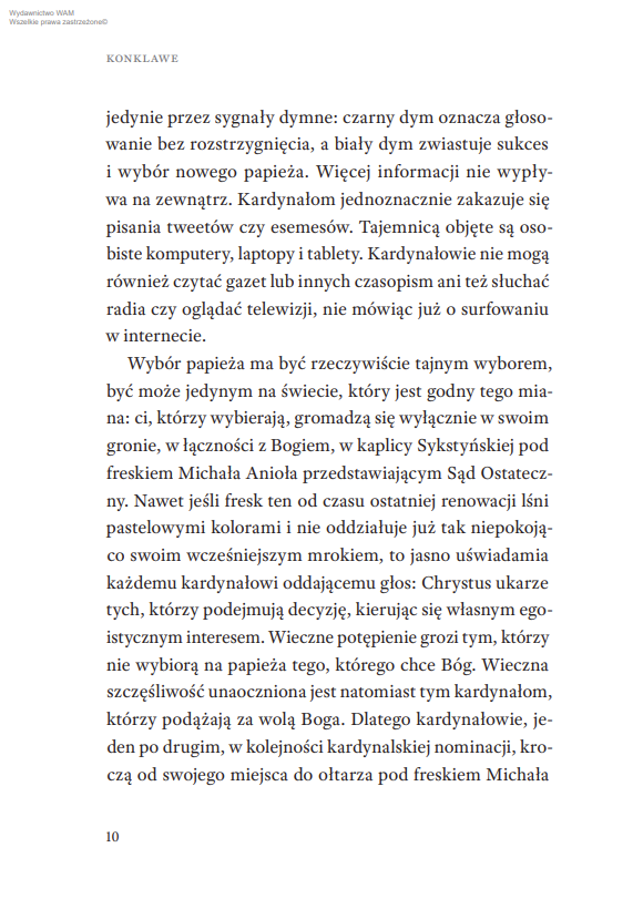 Książka Wolfa pomaga zrozumieć naturę i historię instytucji konklawe. Autor porusza się sprawnie między kościelnym prawem, teologią i konkretnymi wydarzeniami historycznymi, niejednokrotnie bardzo burzliwymi. Przypomina, że Kościół i jego instytucje nie są jedynie boskie, ale i ludzkie – naznaczone rozwojem, pełne trudnych przełomowych momentów.