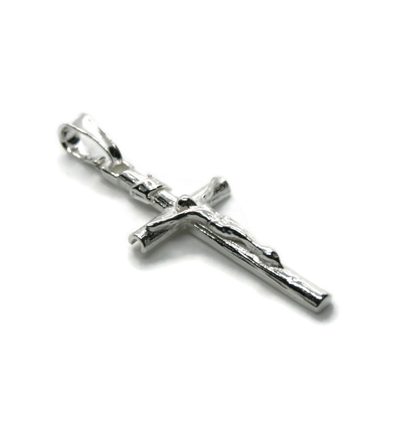 Krzyż srebrny z wizerunkiem Jezusa ma typową formę krzyża, z pionową belką krótszą od poziomej, tworzącą kształt litery T. Wykonany ze srebra próby 925.