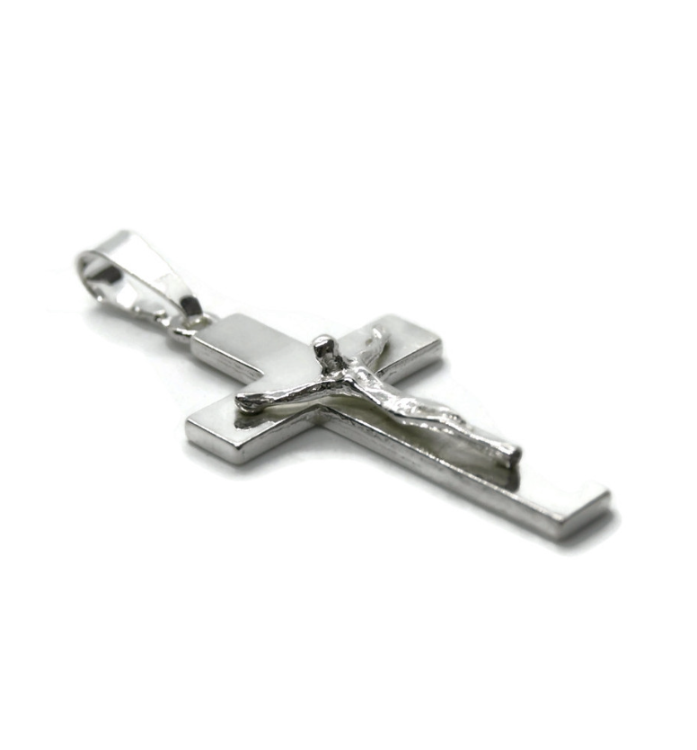 Krzyż srebrny z wizerunkiem Jezusem ma typową formę krzyża, z pionową belką krótszą od poziomej, tworzącą kształt litery T. Krzyżyk wykonany ze srebra próby 925.