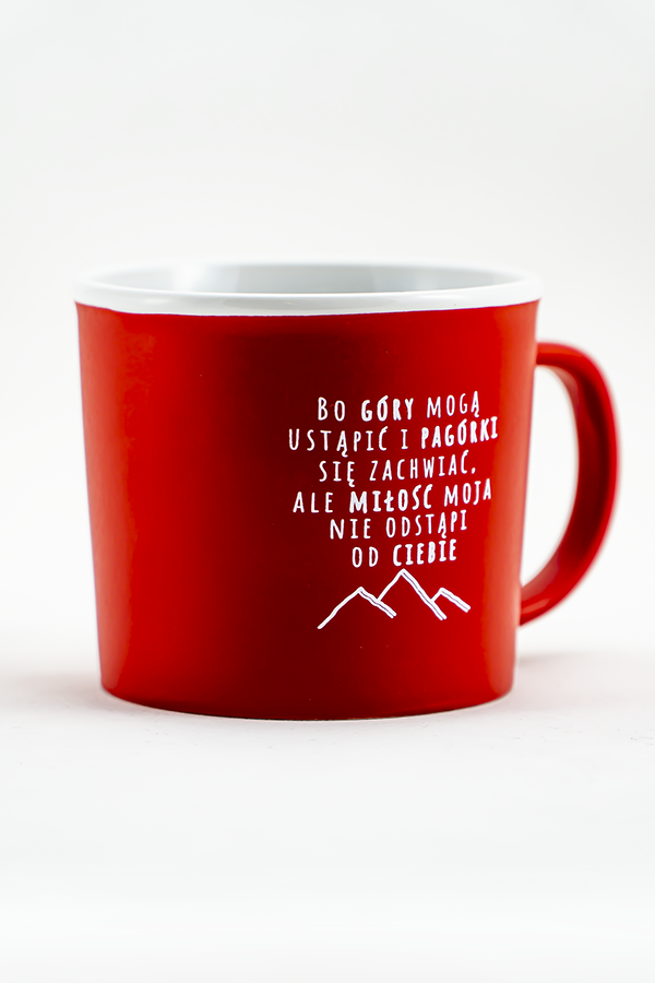 Kubek matowy w kolorze czerwonym z białym nadrukiem.