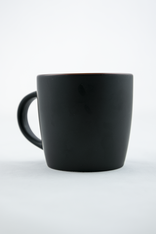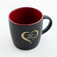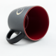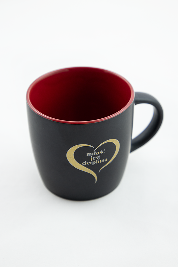 Kubek czarny z czerwonym środkiem w kształcie „beczka”, wykonany z porcelitu.