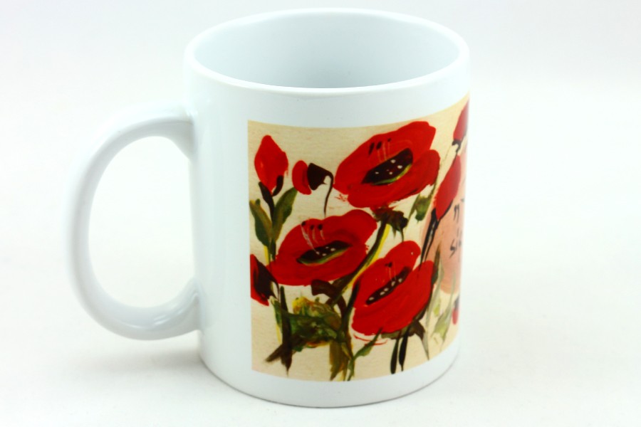 Kubek w kolorze białym z kolorowym nadrukiem.