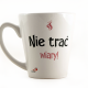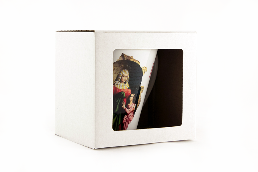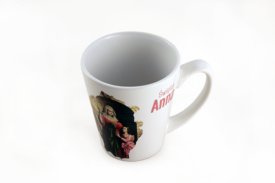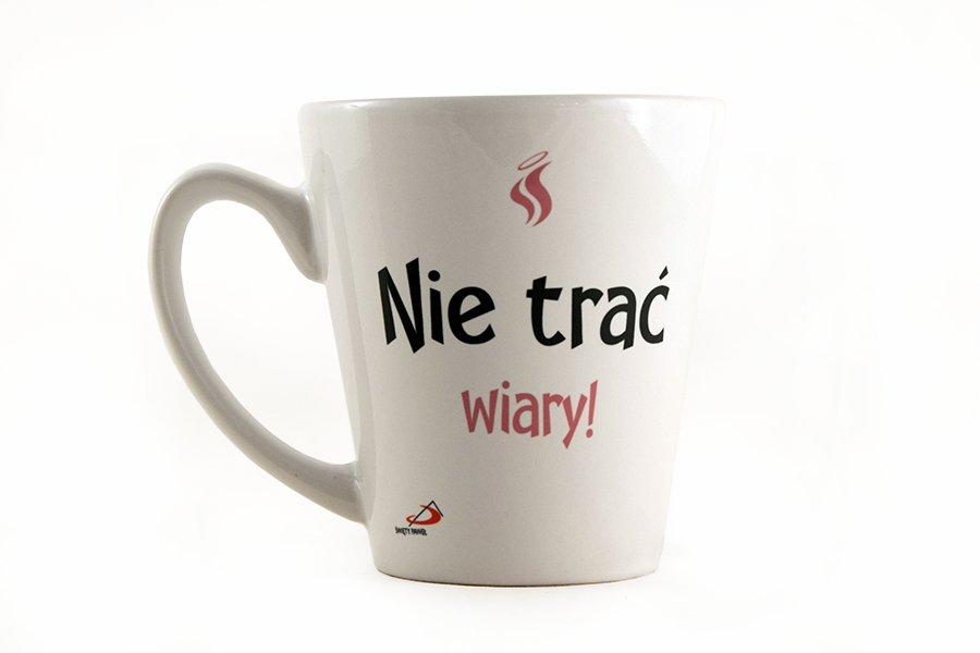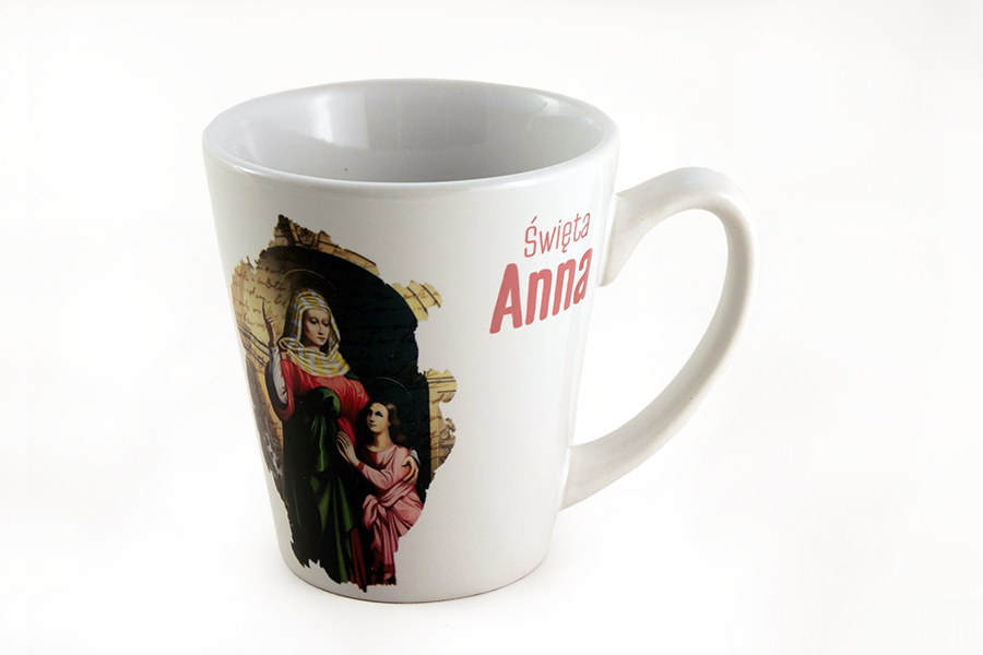 Kubek ceramiczny z wizerunkiem świętej Anny, patronki małżeństw, matek, wdów, piekarzy i żeglarzy, z napisem: Nie trać wiary!.