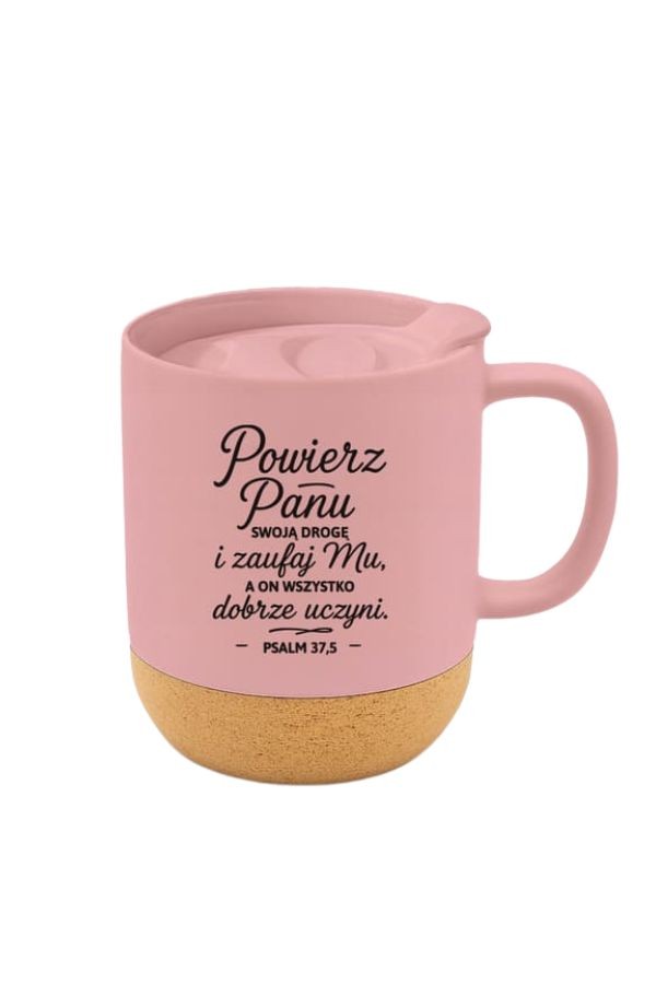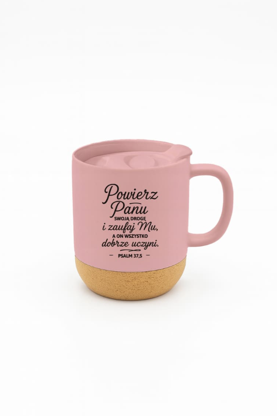 Szukasz wyjątkowego kubka, który będzie przypominał Ci o zaufaniu Bogu w każdej chwili? Ten różowy kubek z wieczkiem i korkowym spodem z cytatem z Psalmu 37,5: „Powierz Panu swoją drogę i zaufaj Mu, a On wszystko dobrze uczyni” to idealny wybór.