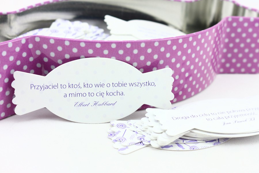 100 dobrych i pełnych ciepła myśli, które osłodzą każdy dzień i do tego bez zbędnych kalorii. Wszystko podane w formie metalowego pudełka wypełnionego kartonikami w kształcie cukierków z hasłem dnia. Znajdziemy tu powiedzenia, mądrości, a także myśli znanych i cenionych ludzi – Wisławy Szymborskiej, Jana Pawła II, ks. Jana Twardowskiego, Phila Bosmansa i wielu innych.