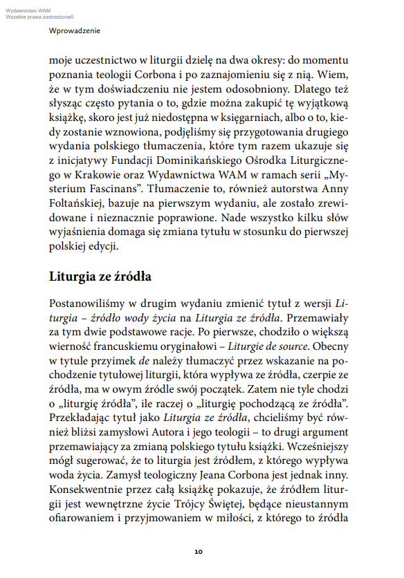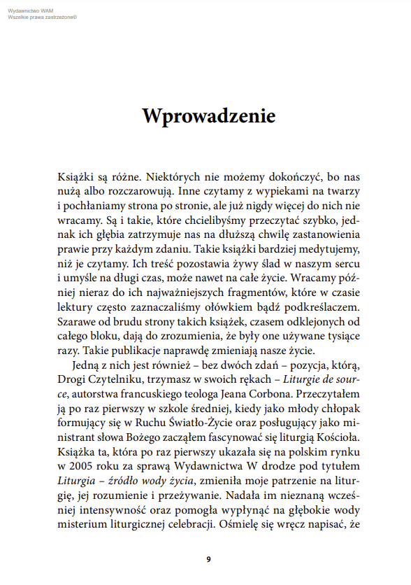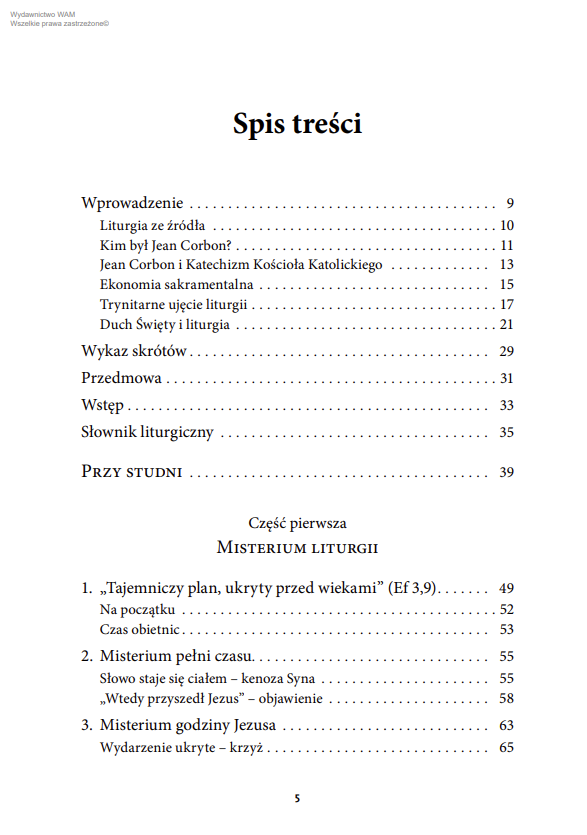 Niektórzy dzielą swoje uczestnictwo w liturgii na dwa okresy: do momentu poznania teologii Jeana Corbona i po zaznajomieniu się z nią. Jego klasyczne dzieło na jej temat jest bowiem niezwykłą medytacyjną podróżą w głąb misterium. Francuski teolog – czerpiący obficie z Pisma Świętego oraz z bogactwa Tradycji chrześcijańskiego Wschodu i Zachodu – otwiera przed czytelnikami nieznane wcześniej horyzonty. Podpowiada, jak przeżywać uczestnictwo w Eucharystii, by owocowało ono miłością i żywą relacją z Chrystusem oraz uwrażliwiało na bliźnich.