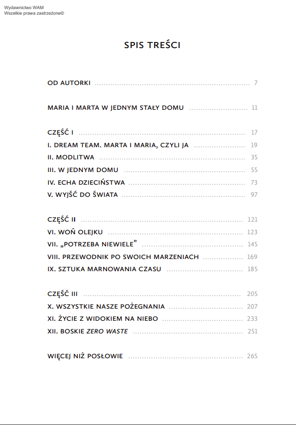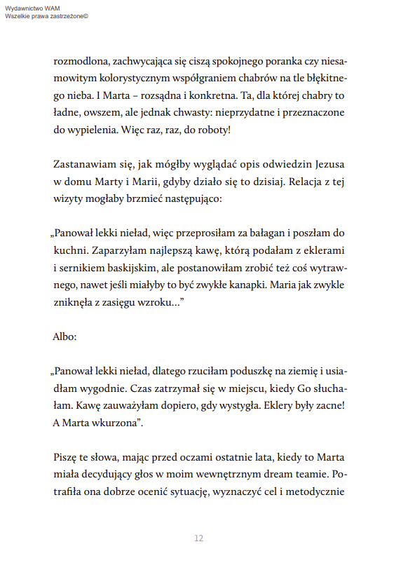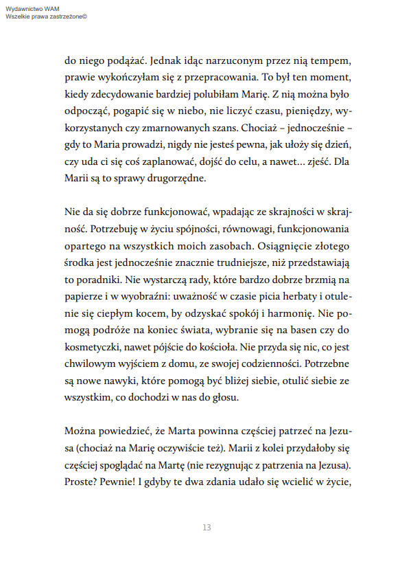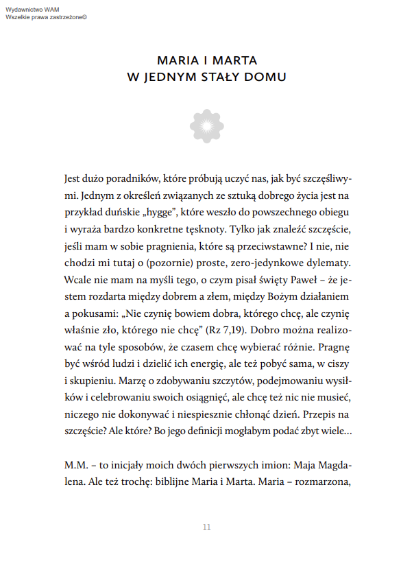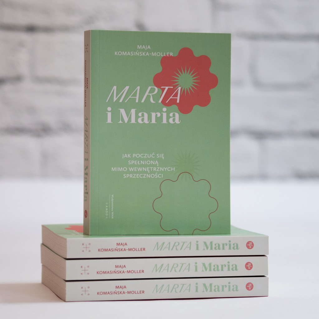 Maja Komasińska-Moller w osobistej, wzruszającej, chwilami zabawnej opowieści o życiu w przyjaźni ze sobą przywołuje biblijne postaci Marii i Marty. Pierwsza symbolizuje tę część naszej osobowości, której bliskie są kontemplacja, kreatywność i intuicja. Druga – zorganizowanie, logiczne myślenie, zdrowy rozsądek i przywiązanie do zasad. Kluczem do szczęśliwego życia jest złapanie równowagi między tymi dwiema postawami. Stanu, w którym nie tylko, jak w biblijnej historii, Maria patrzy na Jezusa, a Marta usługuje, lecz w której także Maria patrzy na swoją siostrę, a ta zarówno na obowiązki i na to, czego nie zrobiła Maria, jak i na Jezusa.