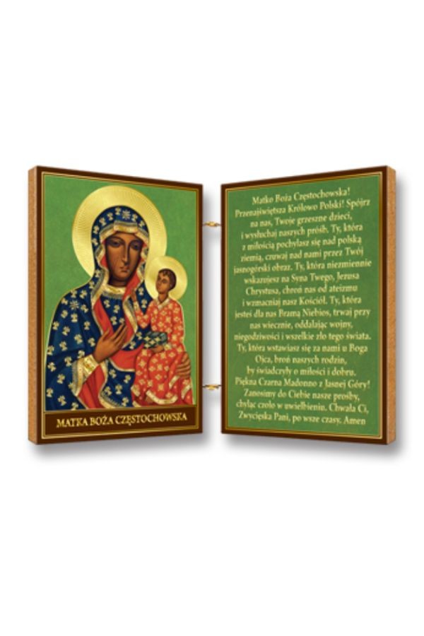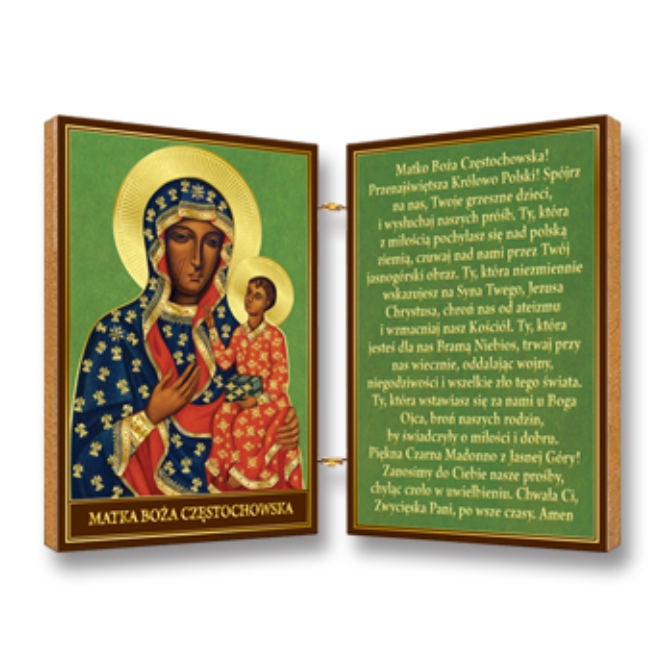 Drewniany dyptyk wykonany na desce, z ikoną Matki Bożej Częstochowskiej i tekstem modlitwy.