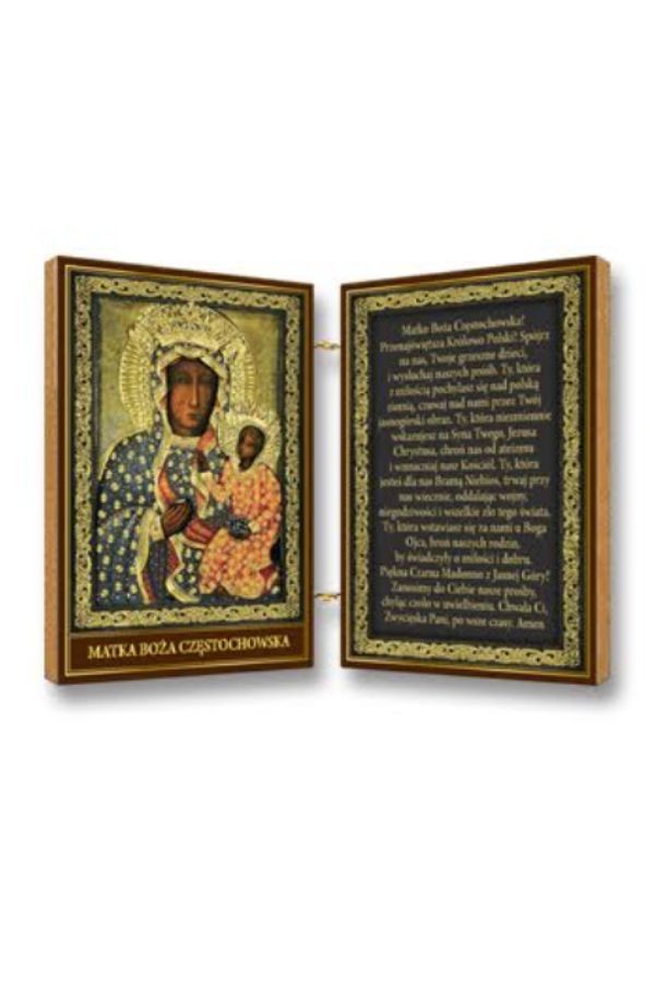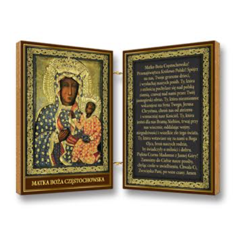 Drewniany dyptyk wykonany na desce, z ikoną Matki Bożej Częstochowskiej i tekstem modlitwy.