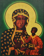Obraz - ikona Matki Bożej Częstochowskiej, wykonywany na desce. Najnowocześniejsza technika druku powoduje, że obraz jest przestrzenny (druk wypukły), dzięki różnej grubości faktur nakładanych na podłoże, którym jest metaliczna folia w kolorze złotym lub srebrnym.
