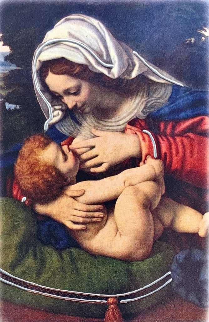 Obraz Matki Bożej Karmiącej malowany na drewnie, z elementami srebrnej dekoracji, wykonanej ręcznie.
