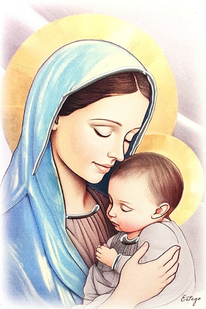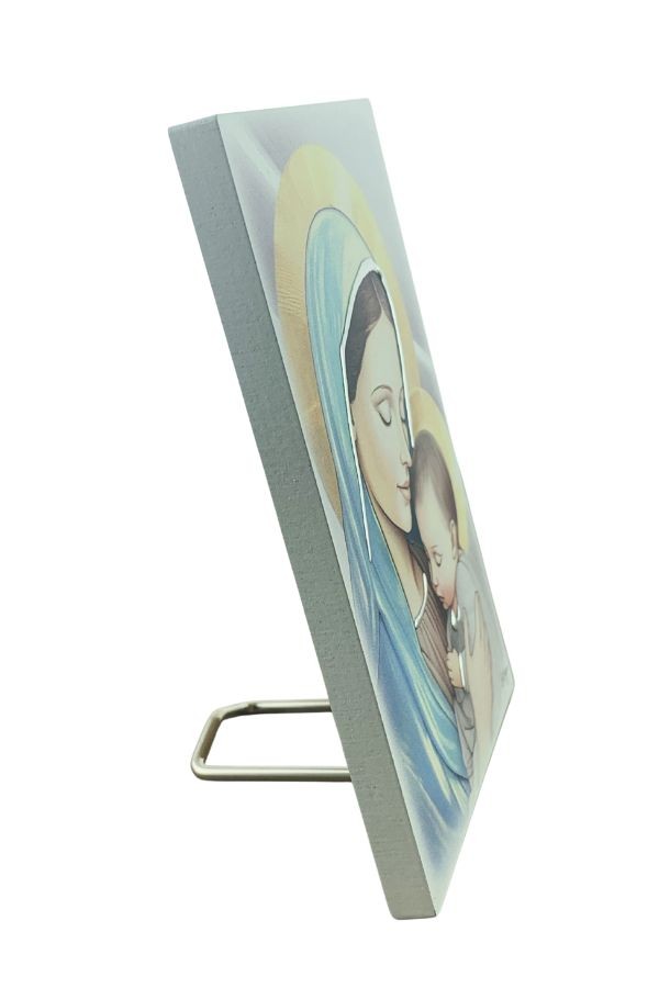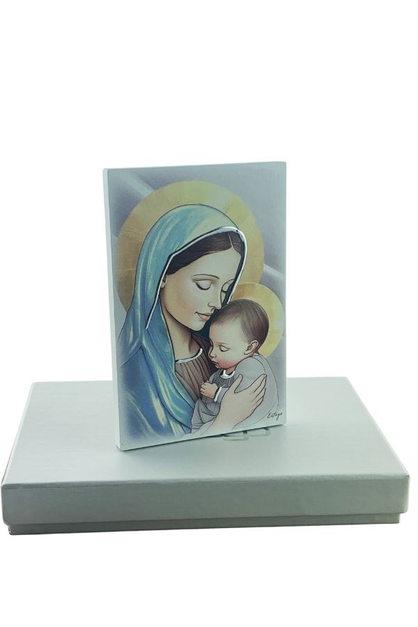 Obraz Matki Bożej z Dzieciątkiem Jezus malowany na drewnie, z elementami srebrnej dekoracji, wykonanej ręcznie. Zapakowany w ozdobne pudełko.