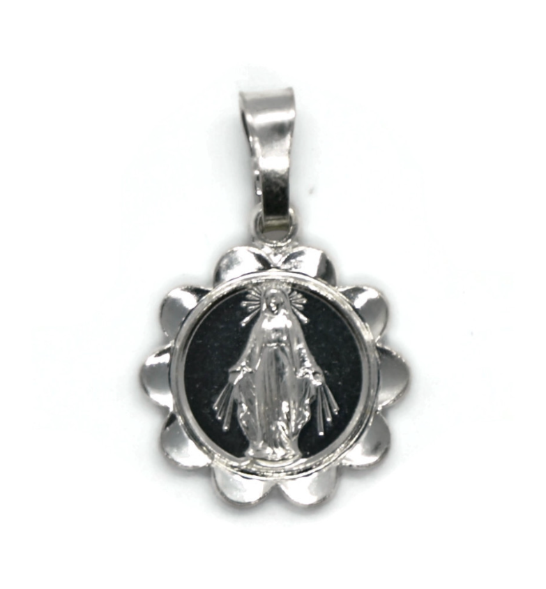 Medalik srebrny z wizerunkiem Matki Boskiej Niepokalanego Poczęcia. Rewers medalika gładki.